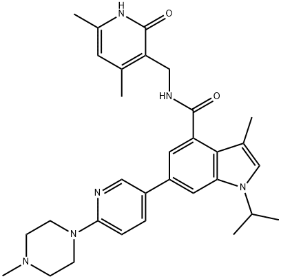 英文名稱:N-((4,6-dimethyl-2-oxo-1,2-dihydropyridin-3-yl)methyl)-1-isopropyl-3-methyl-6-(6-(4-methylpiperazin-1-yl)pyridin-3-yl)-1H-indole-4-carboxamide CAS號:1346572-63-1 分子式:C31H38N6O2 分子量:526.67