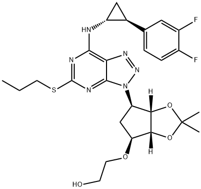 英文名稱:2-[[(3aS,4R,6S,6aR)-4-[7-[[(1R,2S)-2-(3,4-Difluorophenyl)cyclopropyl]amino]-5-(propylthio)-3H-[1,2,3]triazolo[4,5-d]pyrimidin-3-yl]-2,2-dimethyl-tetrahydro-3aH-cyclopenta[d][1,3]dioxol-6-yl]oxy]ethanol CAS號(hào):274693-26-4 分子式:C26H32F2N6O4S 分子量:562.63 EINECS號(hào):682-426-2
